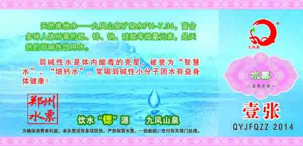 為加大九鳳泉礦泉水的宣傳力度,進一步增強人們愛九鳳泉護九鳳泉的意識,并讓鄭州市民更好地了解九鳳泉、認識九鳳泉,九鳳泉公司總部適時為鄭州分公司發(fā)行新水票,為鄭州水票打制一張新名片。水票上有“九鳳山泉”字樣,清晰的防偽標示,它以嶄新的面孔呈現(xiàn)給大家,讓鄭州市民領略九鳳泉礦泉水的特殊魅力。