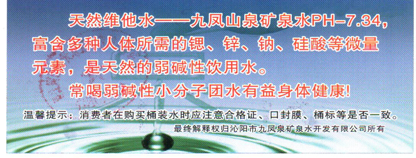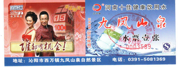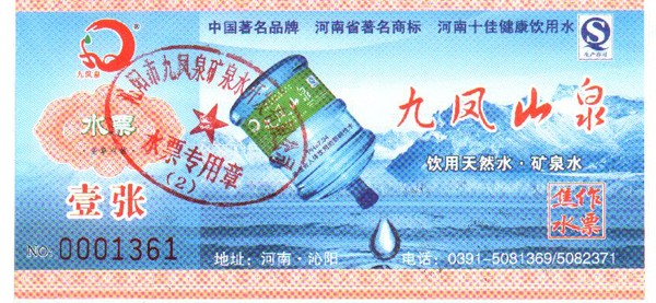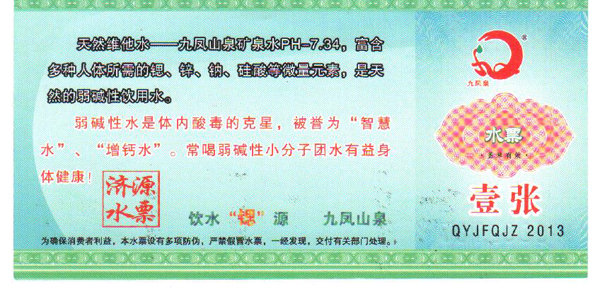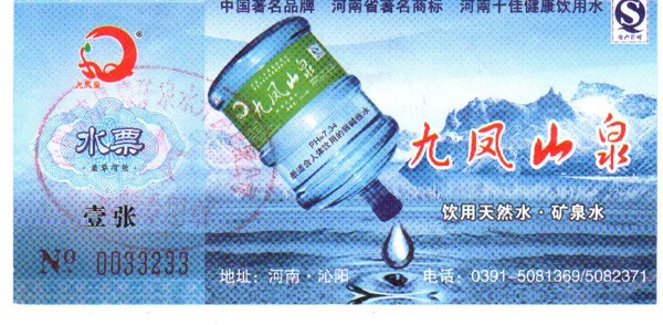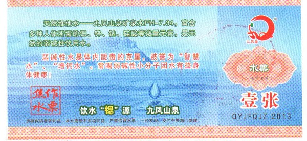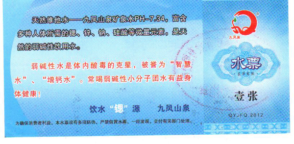 九鳳泉礦泉水開發(fā)有限公司提醒廣大市民:為了您的利益有保障,請(qǐng)一定要購(gòu)買我公司發(fā)行的正規(guī)水票,每一張水票都是經(jīng)過(guò)我們經(jīng)心打制的,水票就是我們的名片,水票上有“九鳳山泉”字樣,清晰的防偽標(biāo)示,加蓋公司的專用公章。正規(guī)水票是對(duì)廣大市的利益保障。以下是我公司各經(jīng)銷區(qū)域正規(guī)水票圖識(shí),請(qǐng)大家認(rèn)真識(shí)別。